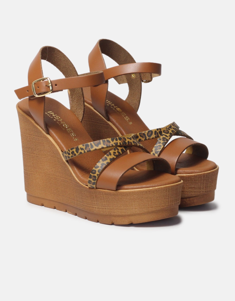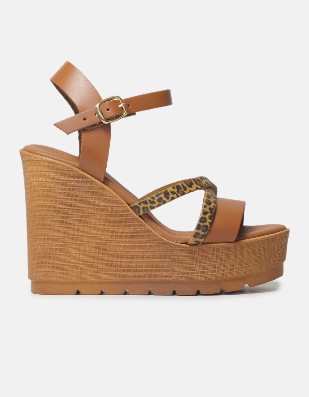 Δερμάτινες ψηλές πλατφόρμες, Ελληνικής κατασκευής. Διαθέτουν χιαστί σχέδιο σε λεοπάρ μοτίβο και δένουν με μπαρέτα στον αστράγαλο.