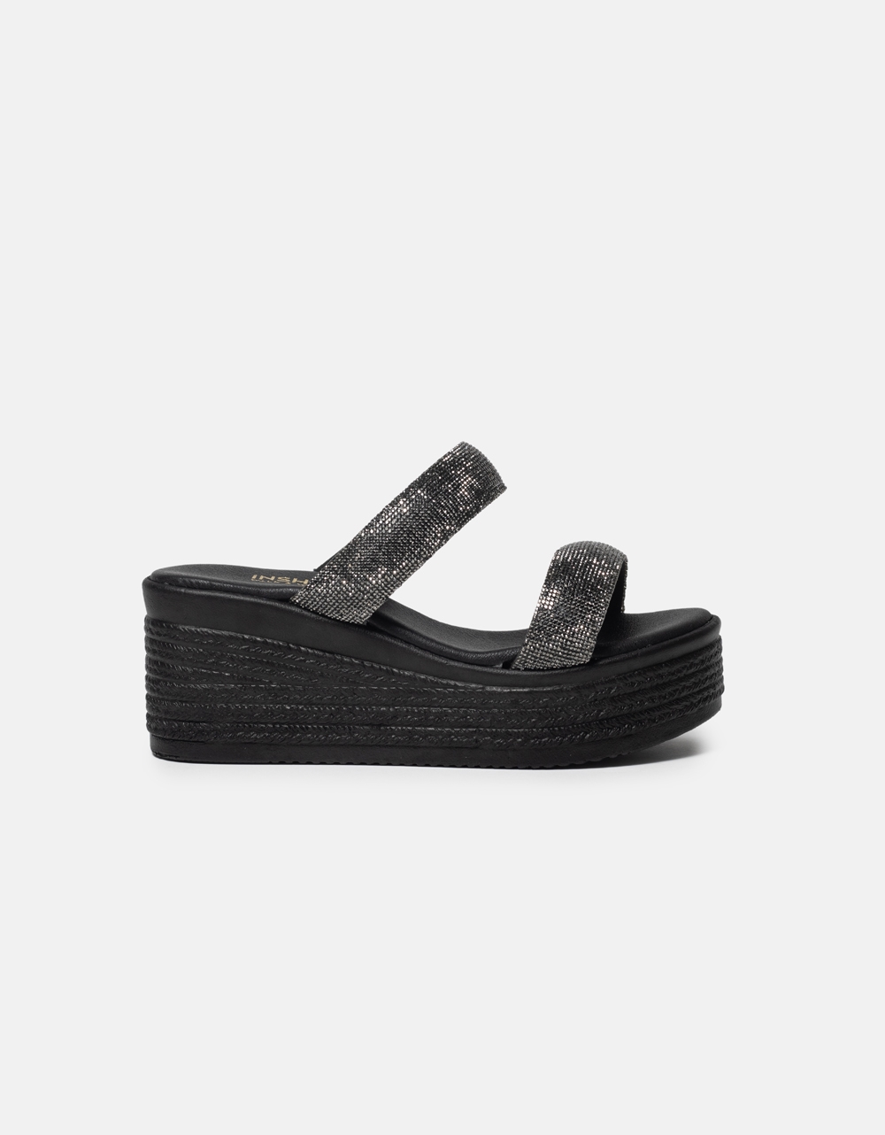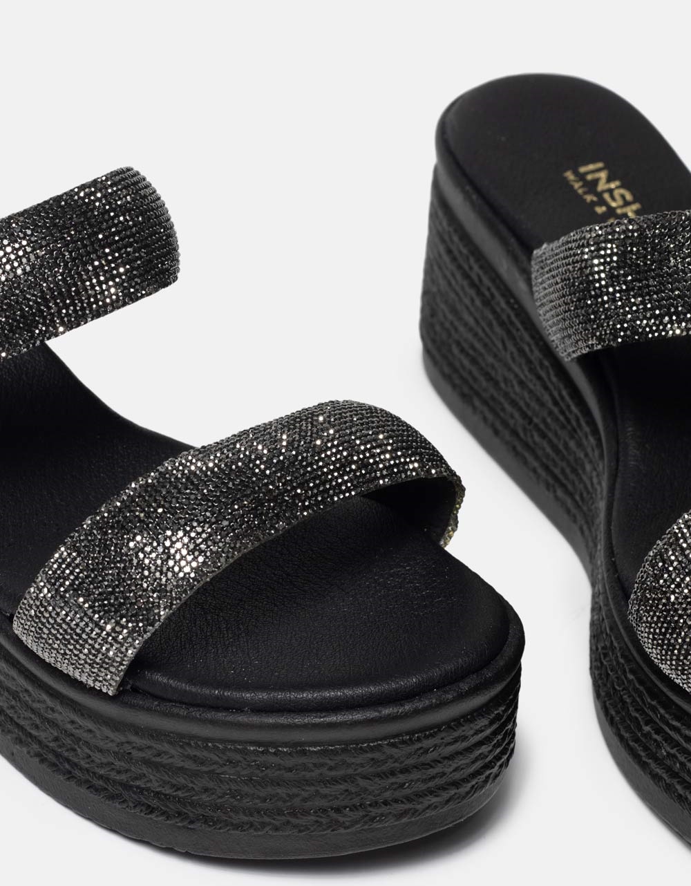 Πλατφόρμες δερμάτινες Ελληνικής κατασκευής με διπλή φάσα από strass. Διαθέτουν αφρώδη πάτο από γνήσιο δέρμα και ελαστική σόλα για άνετο βάδισμα.