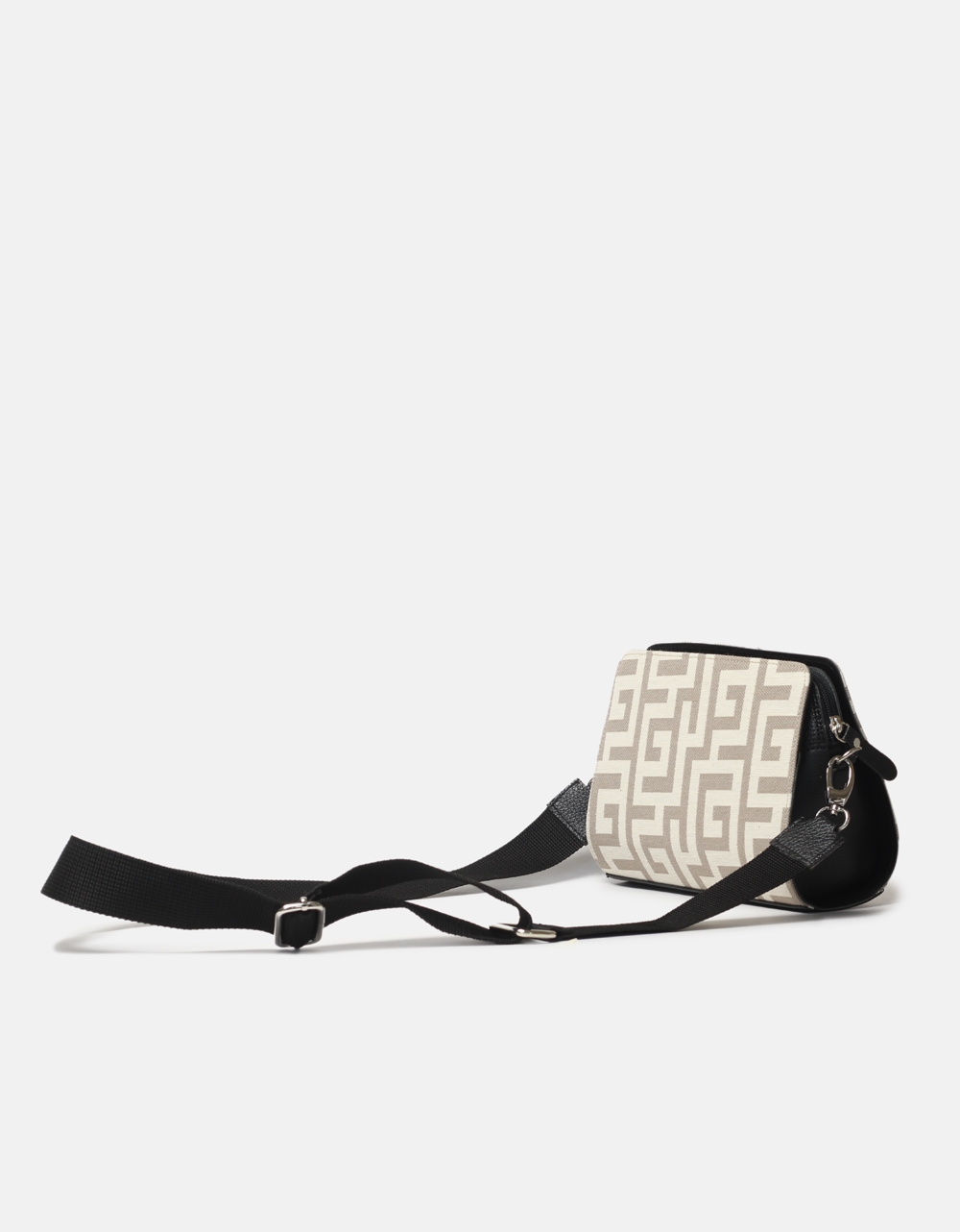 Χειροποίητο τσαντάκι με μαίανδρο χιαστί ελληνικής κατασκευής της εταιρείας ARI GORGIO, από ύφασμα. Διαθέτει προσαρμοζόμενο λουράκι ώμου και κλείνει με φερμουάρ.