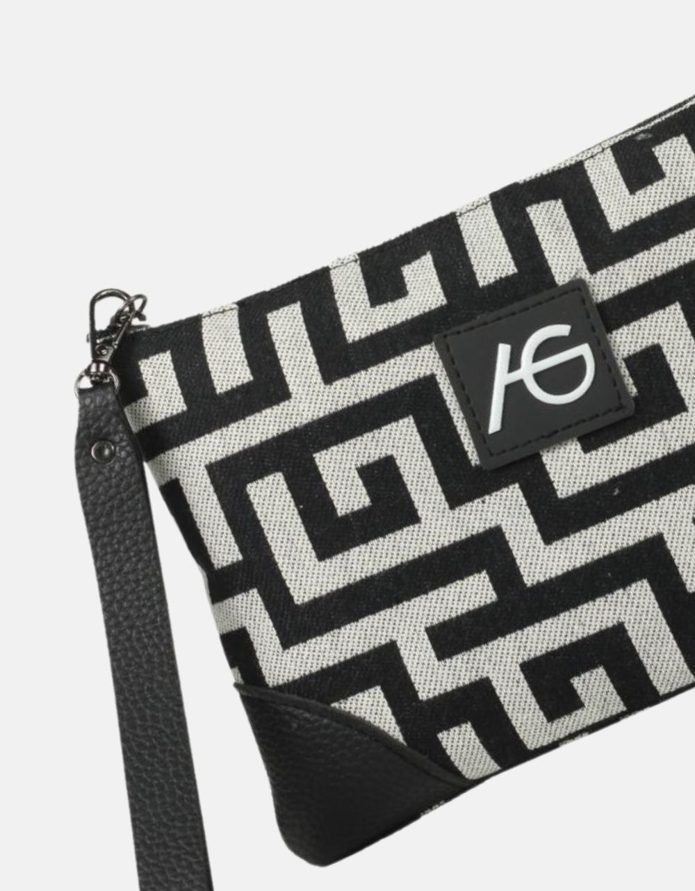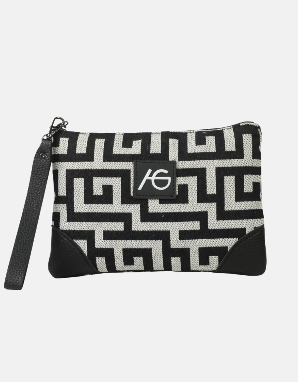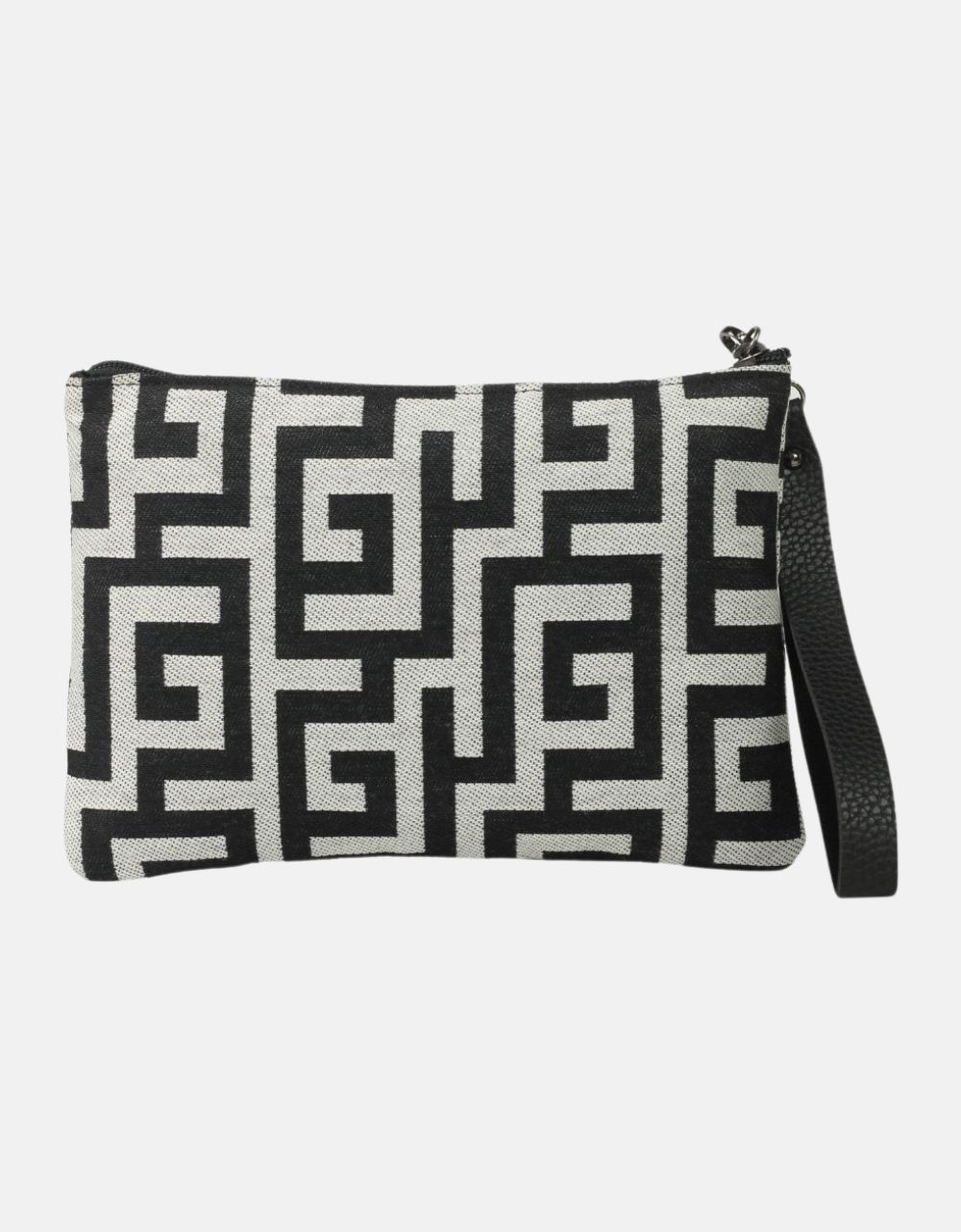 Γυναικείο χειροποίητο τσαντάκι χειρός με μαίανδρο Ελληνικής κατασκευής με μαίανδρο. Κατασκευασμένο από ύφασμα, με λουράκι καρπού και κλείνει με φερμουάρ.