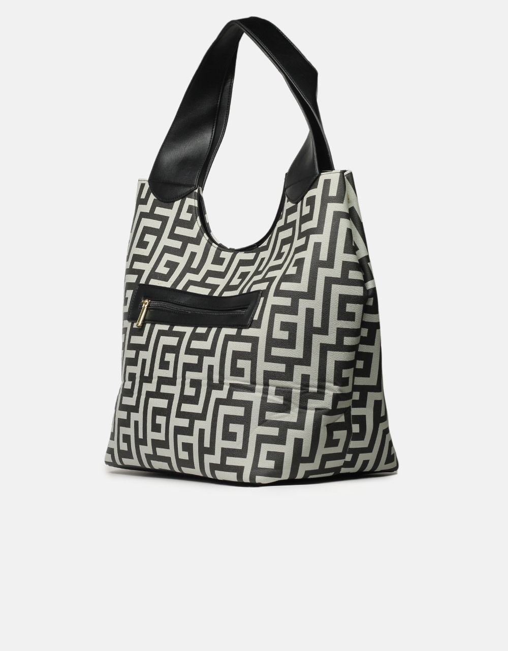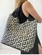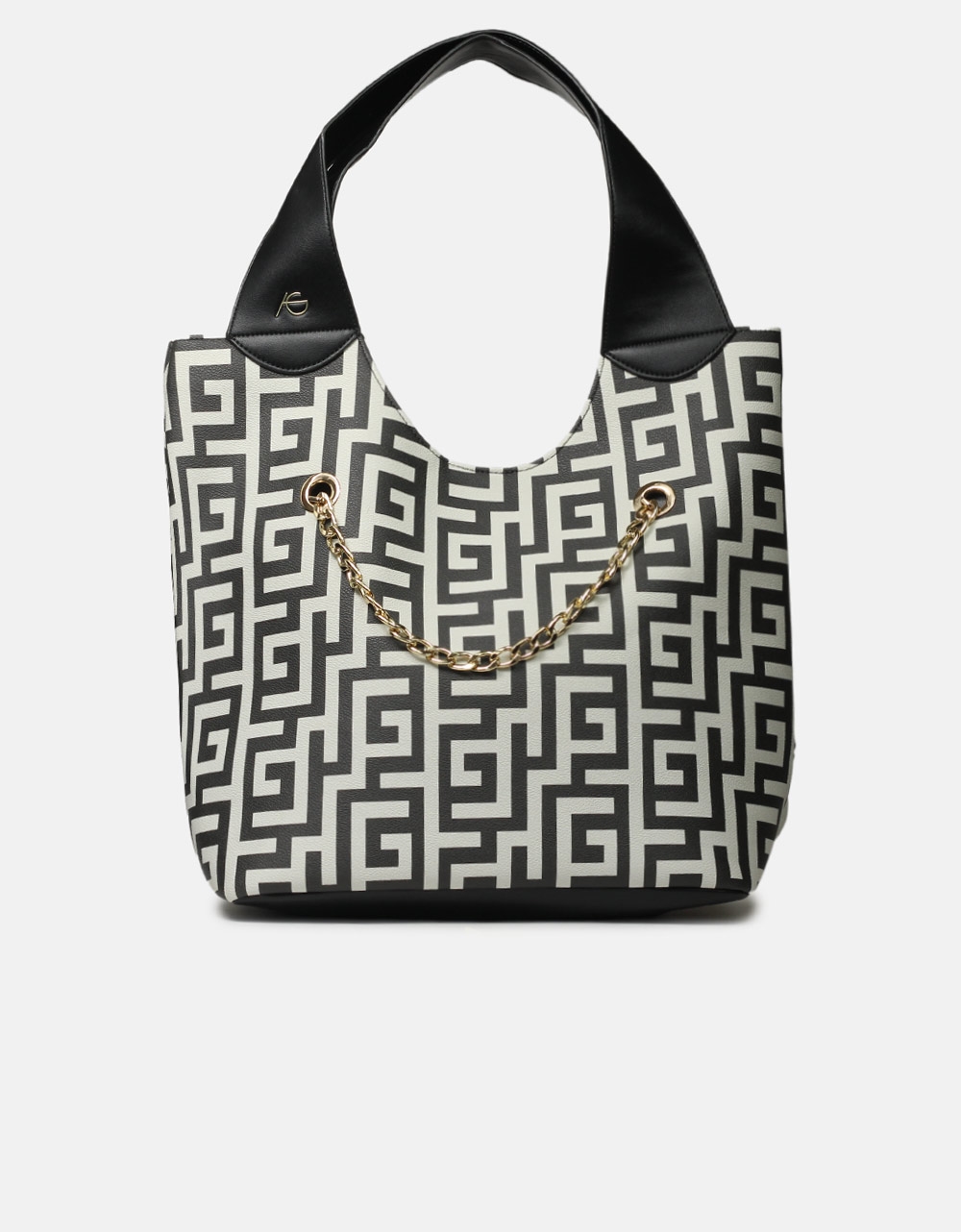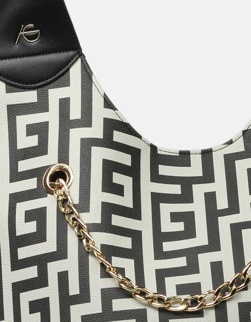 Τσάντα χειρός με μοτίβο μαιάνδρου, Ελληνικής κατασκευής της εταιρείας ARI GORGIO. Διαθέτει διακοσμητική αλυσίδα και κλείνει με μαγνητικό κλιπ.