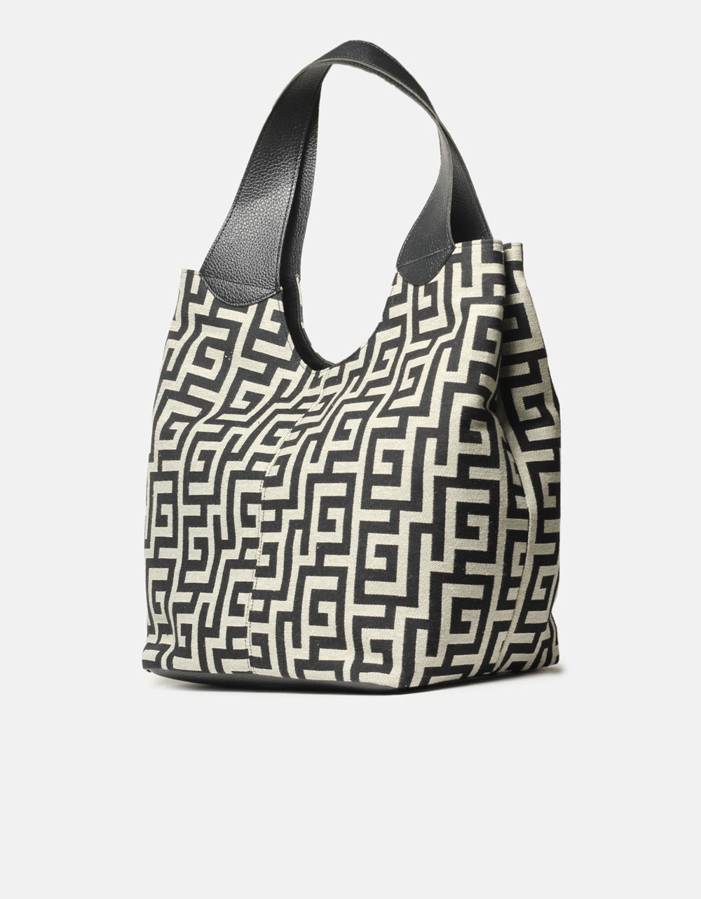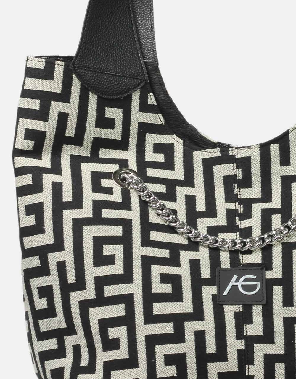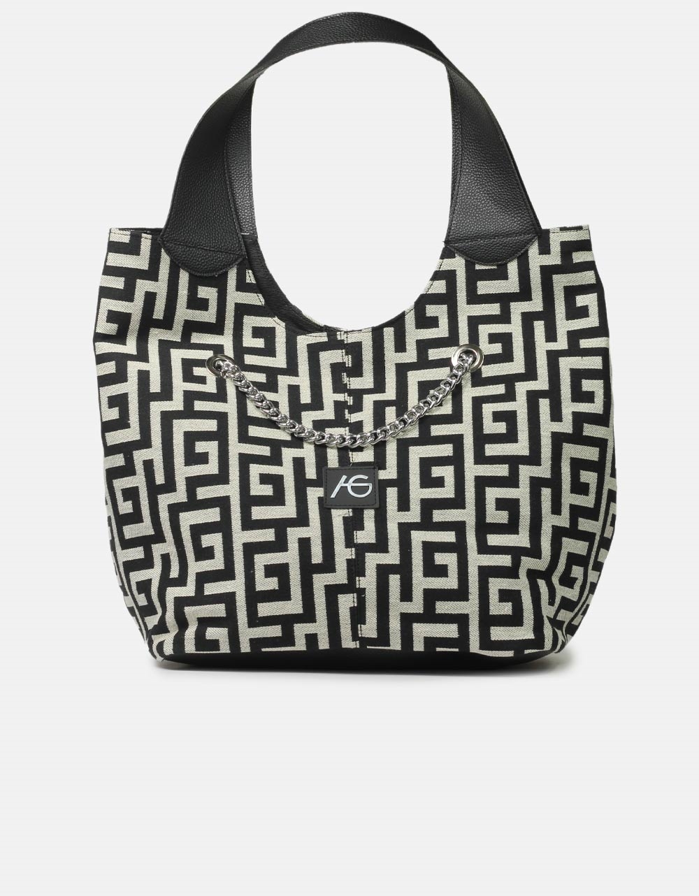 Χειροποίητη τσάντα χειρός Ελληνικής κατασκευής της εταιρείας ARI GORGIO, με μοτίβο μαιάνδρου. Διαθέτει διακοσμητική αλυσίδα και κλείνει με μαγνητικό κλιπ.