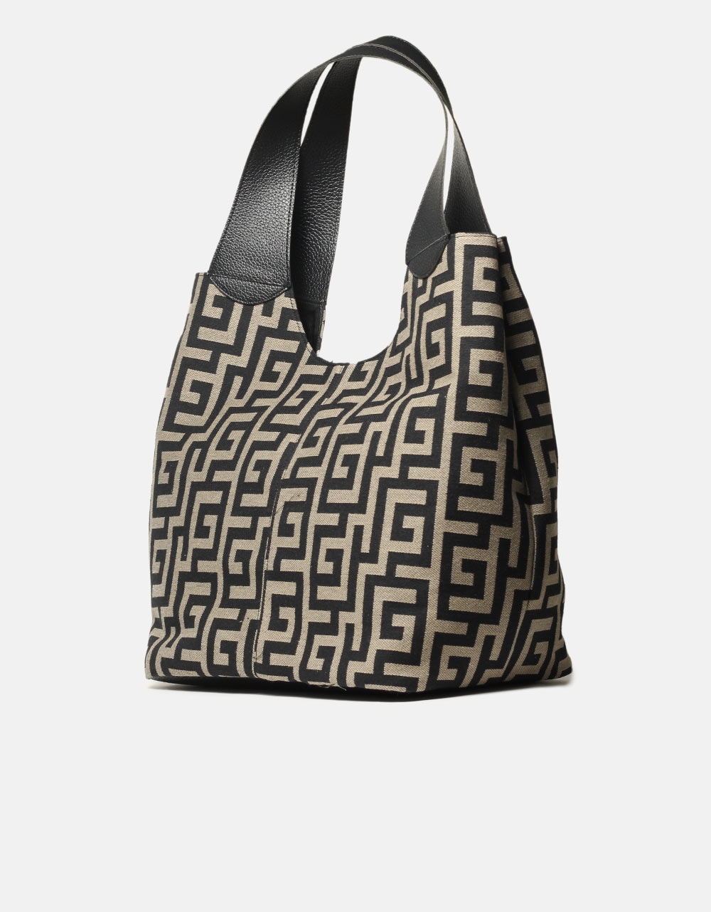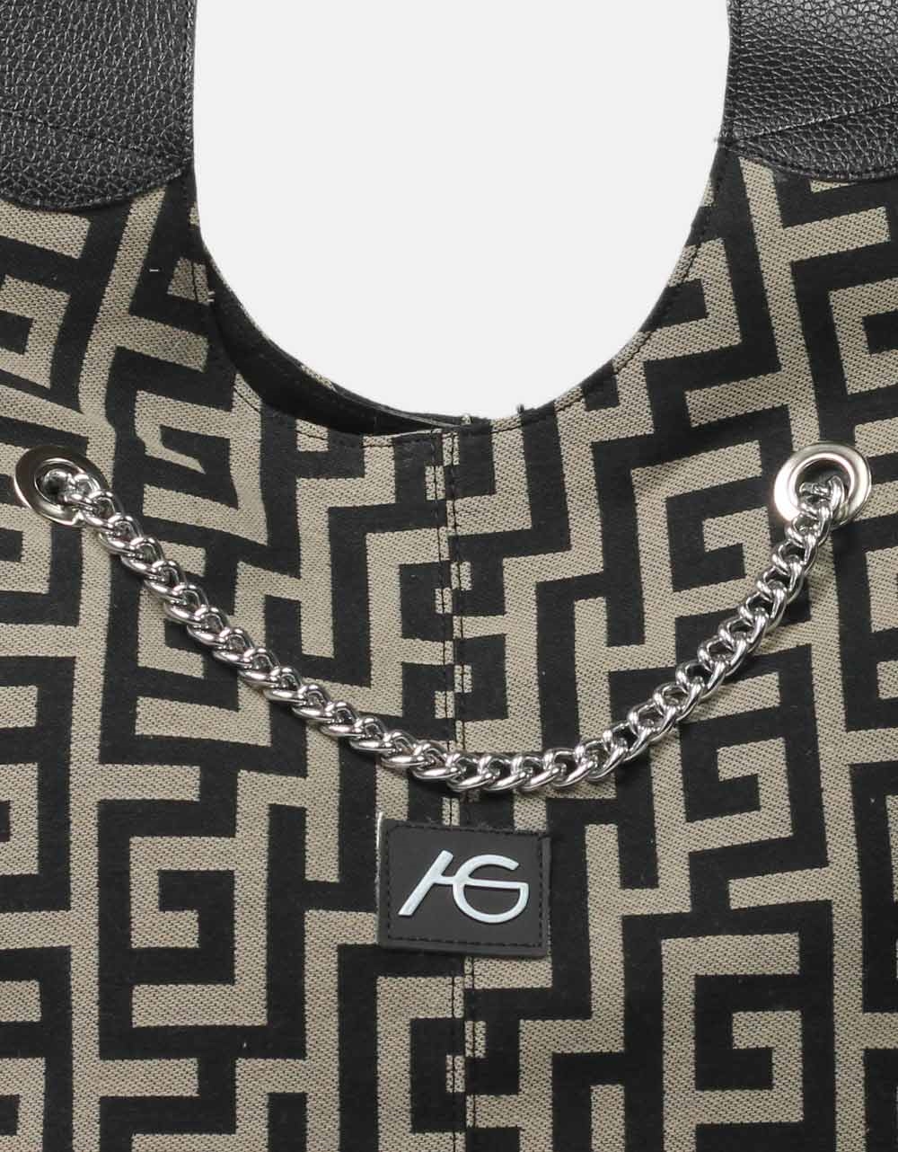 Χειροποίητη τσάντα χειρός Ελληνικής κατασκευής της εταιρείας ARI GORGIO, με μοτίβο μαιάνδρου. Διαθέτει διακοσμητική αλυσίδα και κλείνει με μαγνητικό κλιπ.