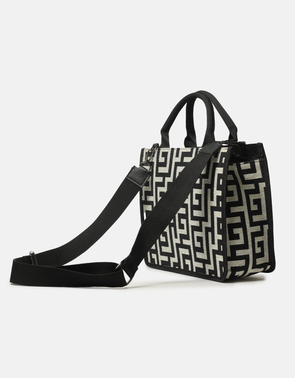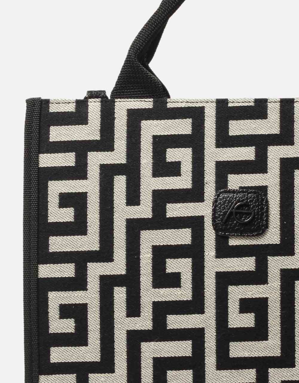 Χειροποίητη τσάντα χειρός Ελληνικής κατασκευής της εταιρείας ARI GORGIO, με μοτίβο μαιάνδρου. Διαθέτει έναν ενιαίο χώρο αποθήκευσης εσωτερικά, προσαρμοζόμενο λουρί ώμου και κλείνει με φερμουάρ.