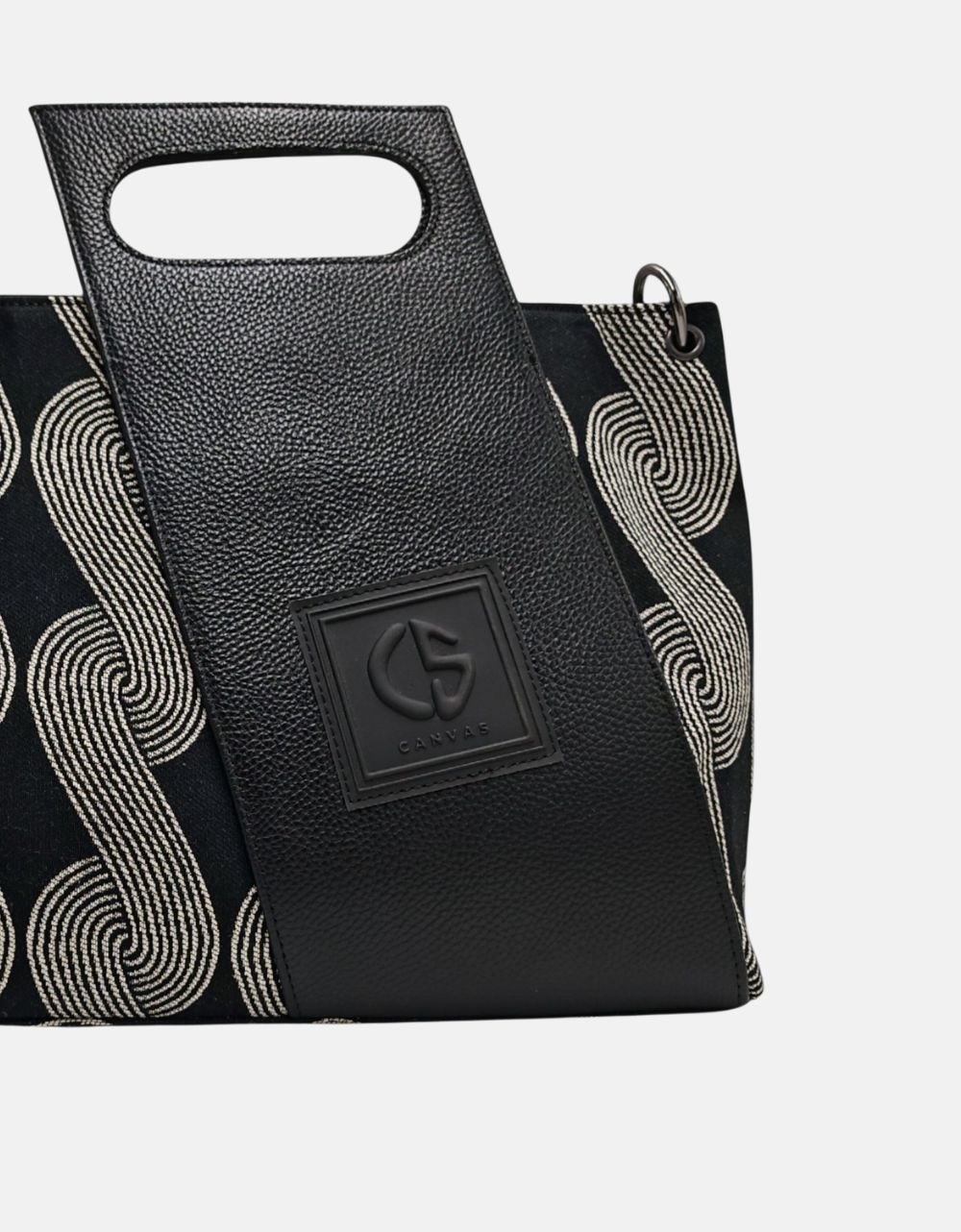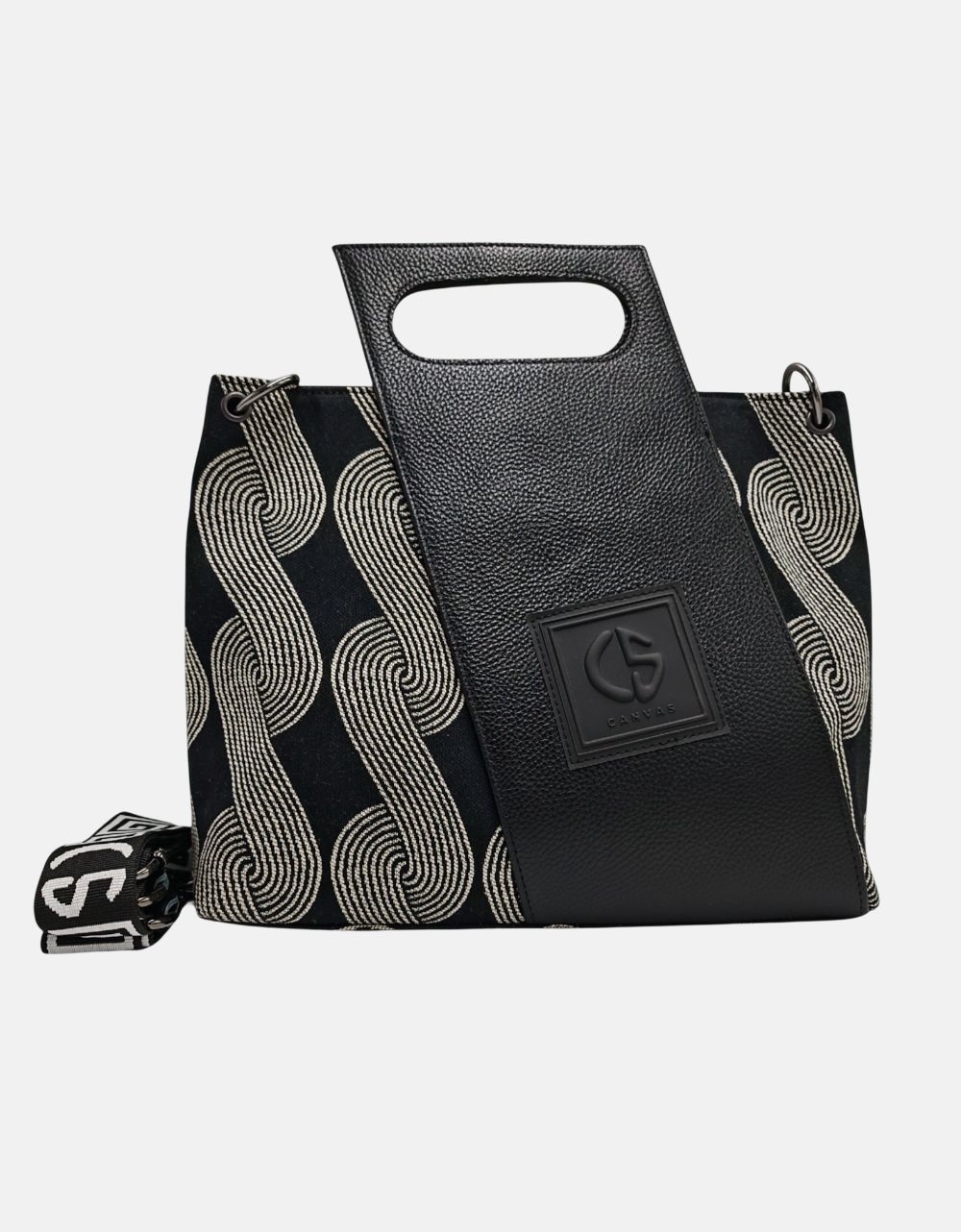 Xειροποίητη τσάντα χειρός με μοτίβο μαιάνδρου και κλίπ της εταιρείας Canva the bags. Είναι κατασκευασμένη από ύφαμα πολύ ευρύχωρη με εσωτερικά χωρίσματα και κλείνει με μαγνητικό κλίπ.