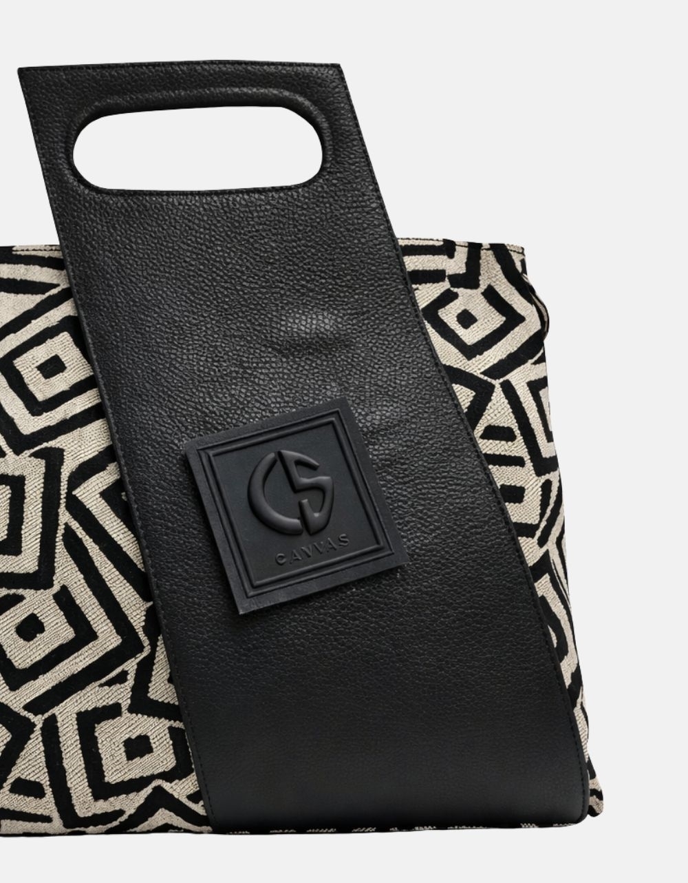 Xειροποίητη τσάντα χειρός με μοτίβο μαιάνδρου και κλίπ της εταιρείας Canva the bags. Είναι κατασκευασμένη από ύφαμα πολύ ευρύχωρη με εσωτερικά χωρίσματα και κλείνει με μαγνητικό κλίπ.