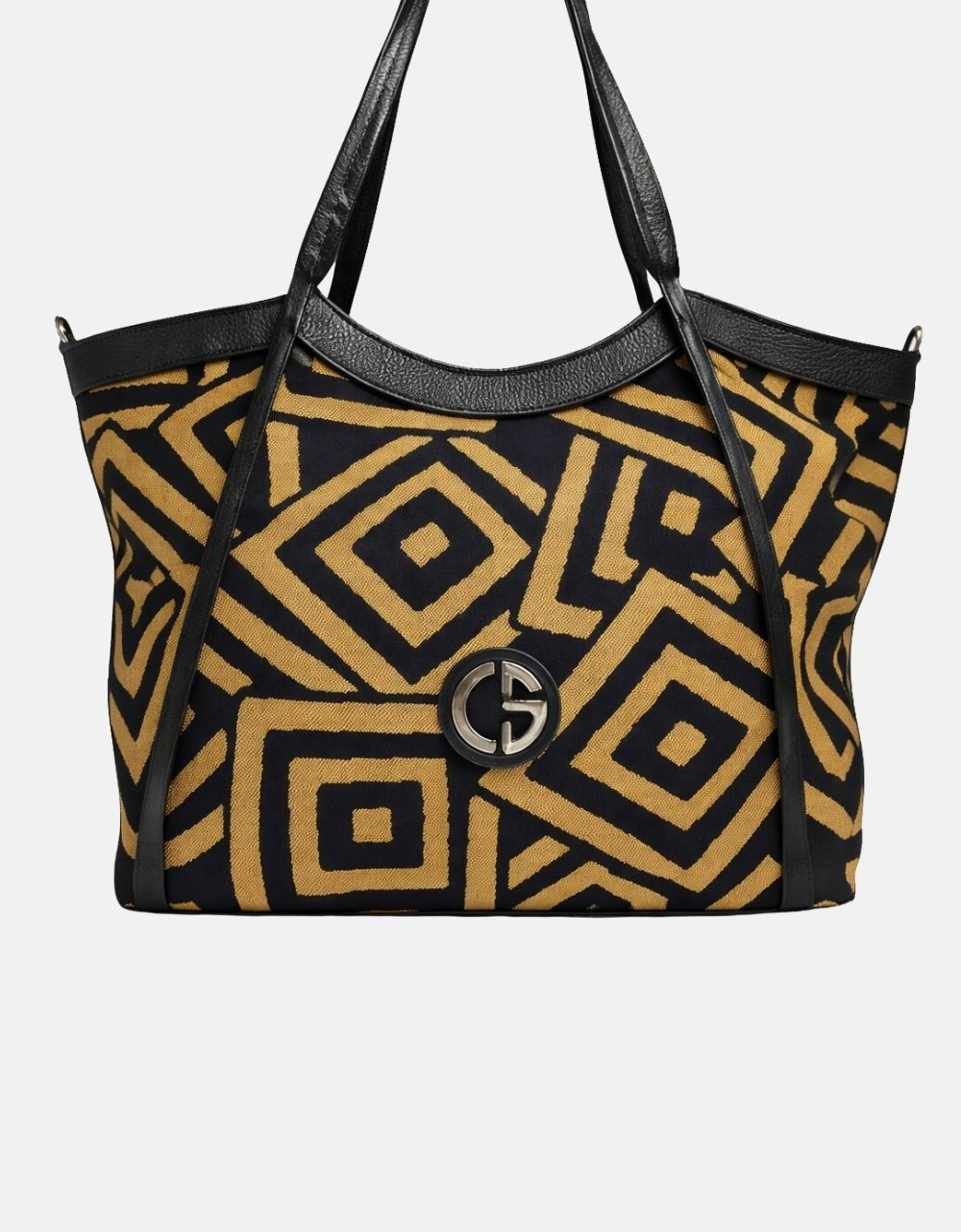 Xειροποίητη τσάντα χειρός με μοτίβο μαιάνδρου και κλίπ της εταιρείας Canva the bags. Είναι κατασκευασμένη από ύφαμα πολύ ευρύχωρη με εσωτερικά χωρίσματα και κλείνει με μαγνητικό κλίπ.