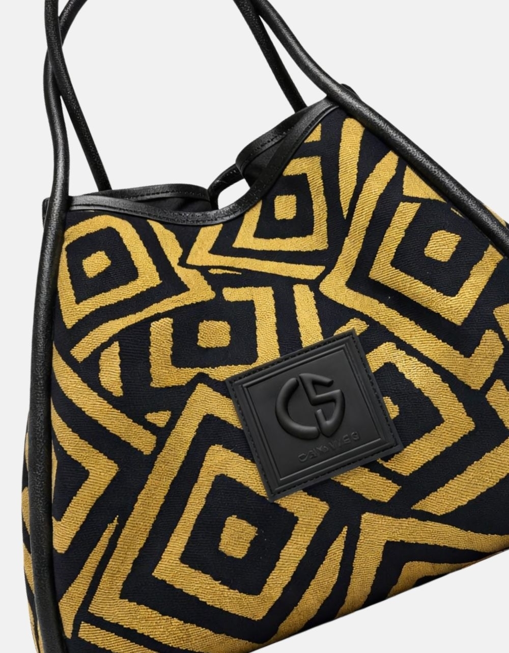 Xειροποίητη τσάντα χειρός με μοτίβο μαιάνδρου και κλίπ της εταιρείας Canva the bags. Είναι κατασκευασμένη από ύφαμα πολύ ευρύχωρη με εσωτερικά χωρίσματα και κλείνει με μαγνητικό κλίπ.