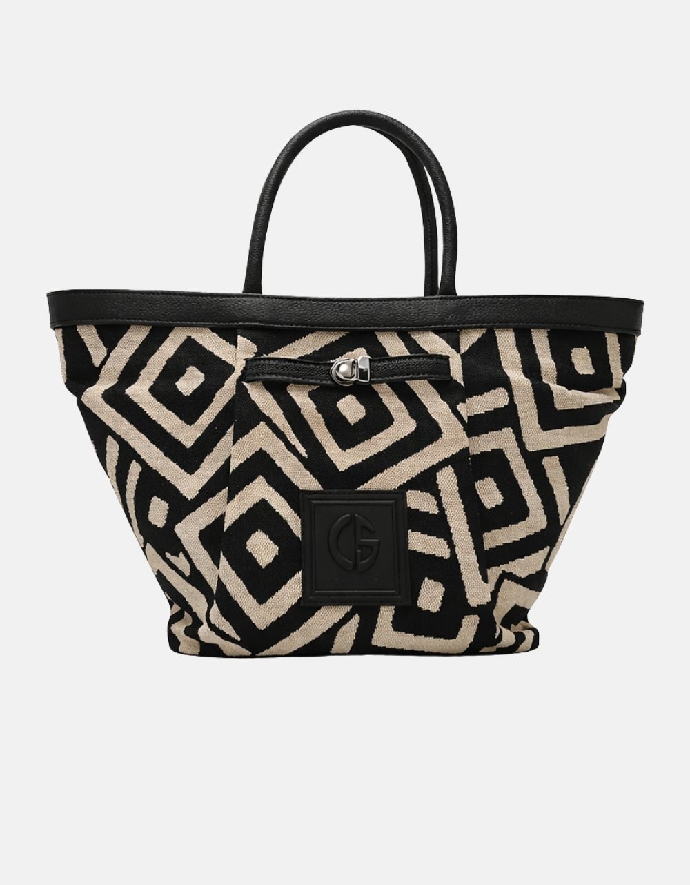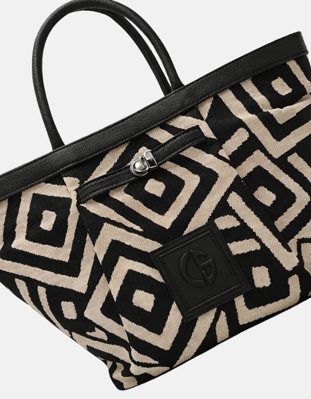 Xειροποίητη τσάντα χειρός με μοτίβο μαιάνδρου και κλίπ της εταιρείας Canva the bags. Είναι κατασκευασμένη από ύφαμα πολύ ευρύχωρη με εσωτερικά χωρίσματα και κλείνει με μαγνητικό κλίπ.